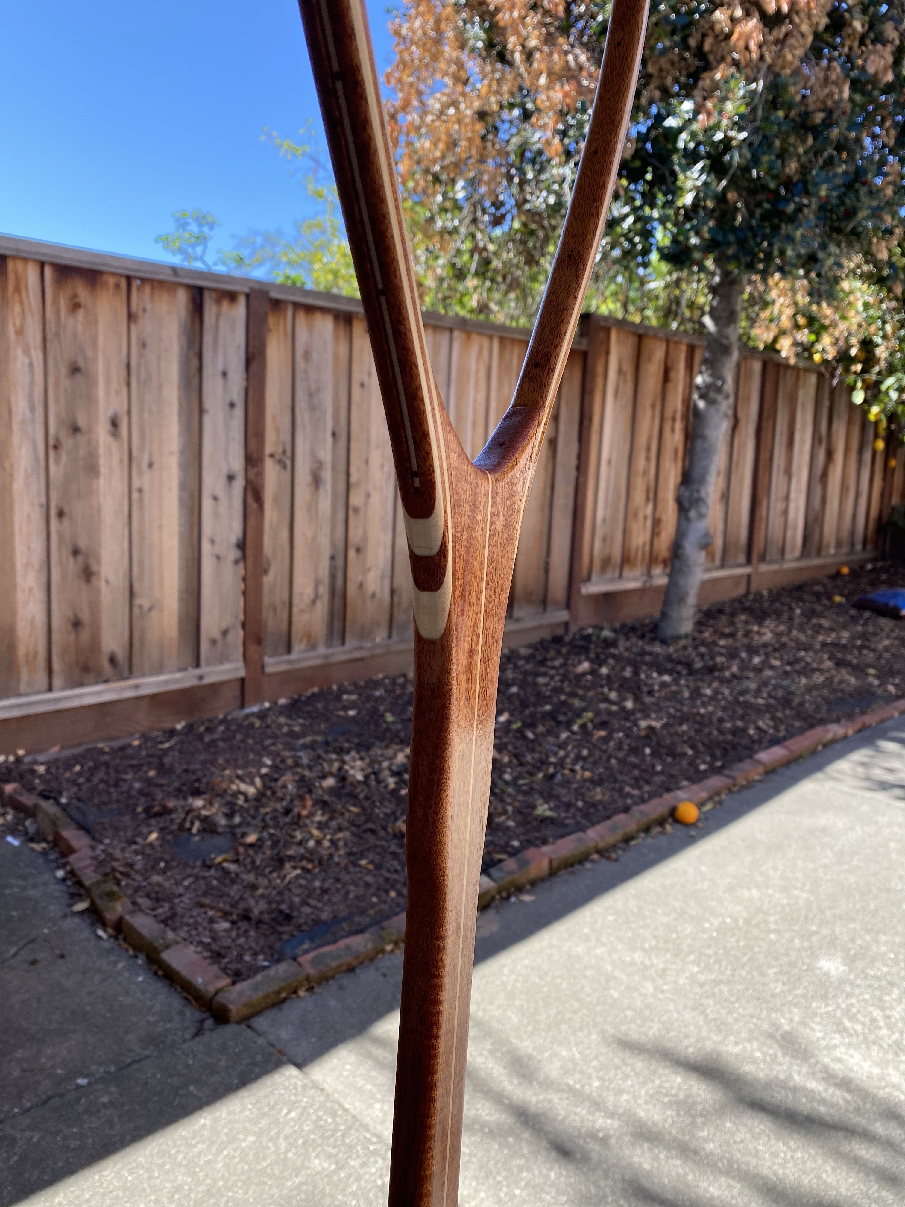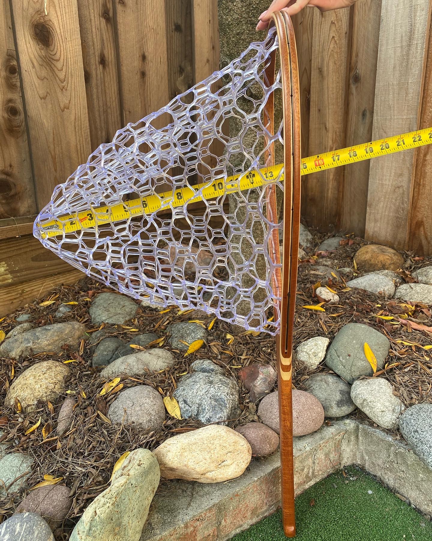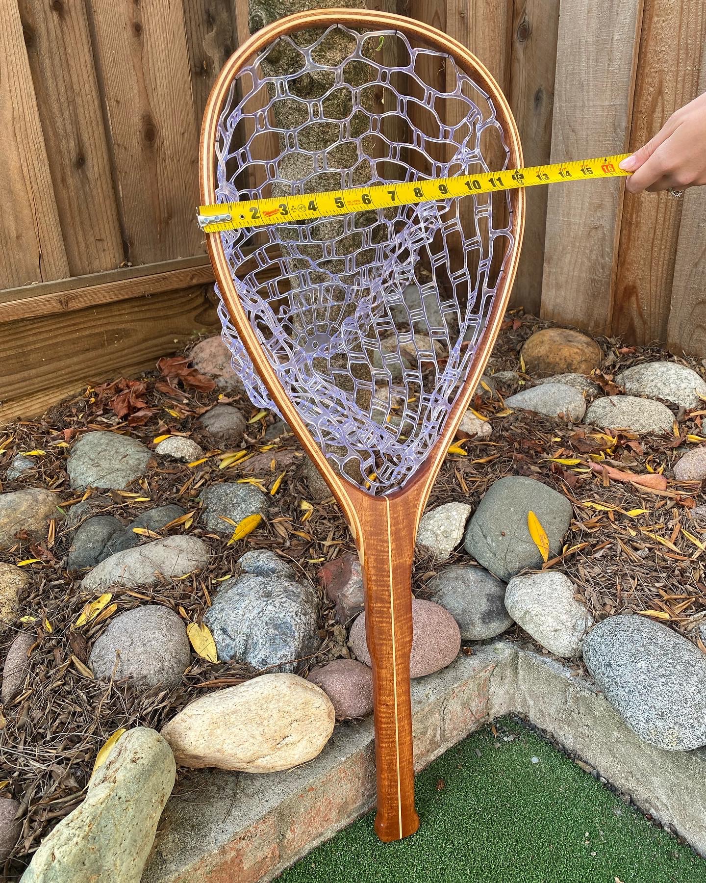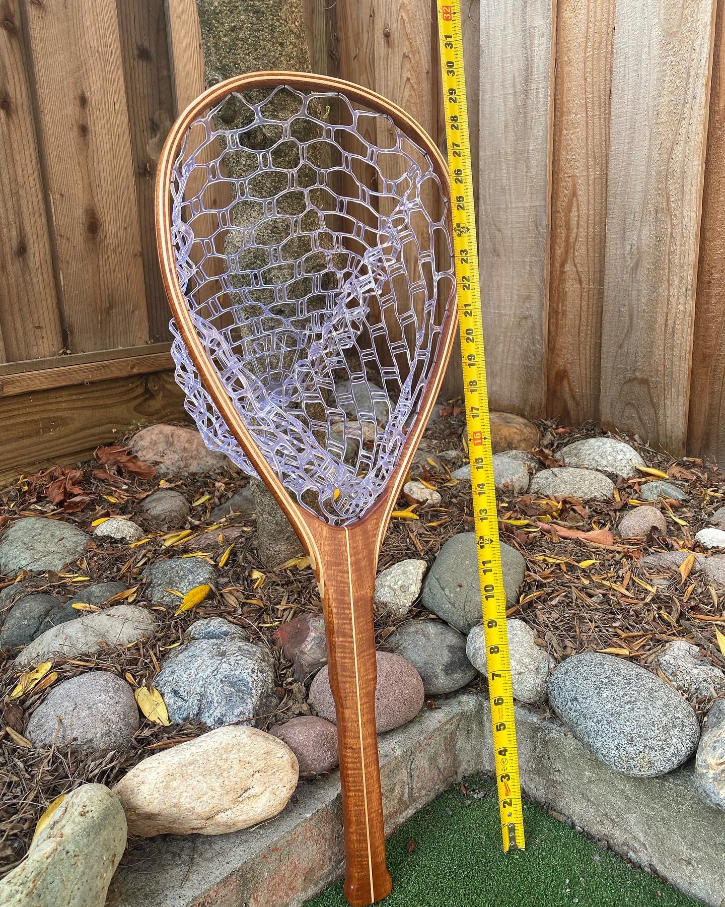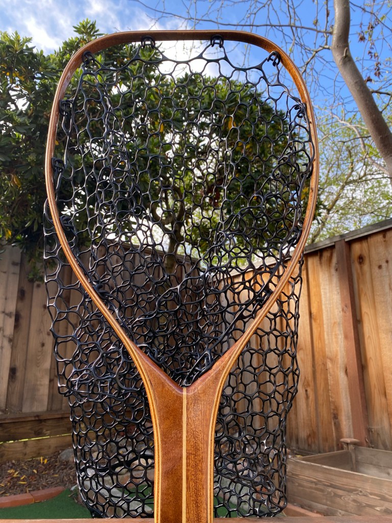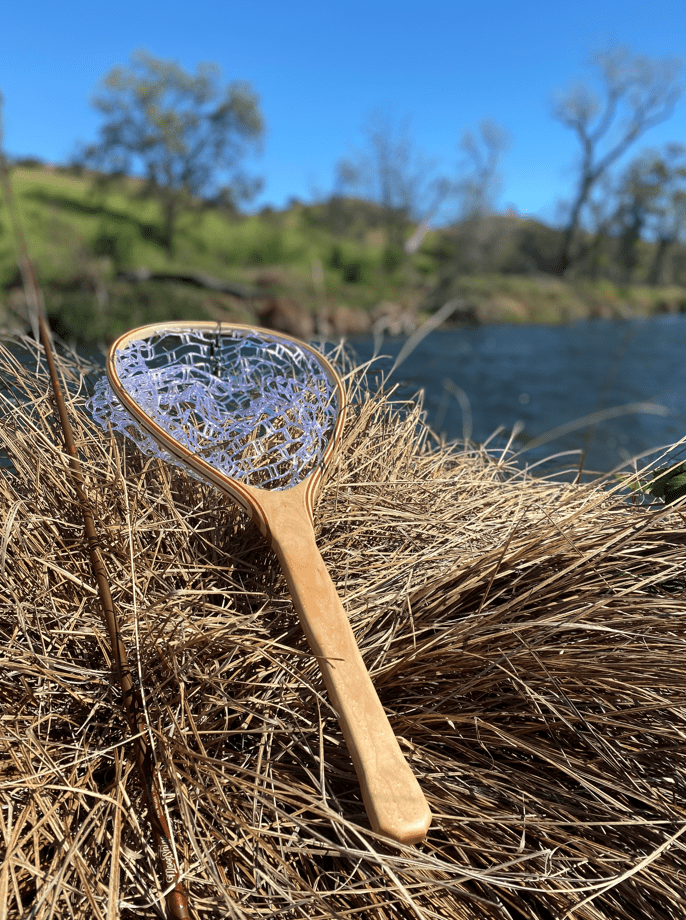 The net pictured above is made from African Mahogany and Curly Maple for a lightweight and strong construction.